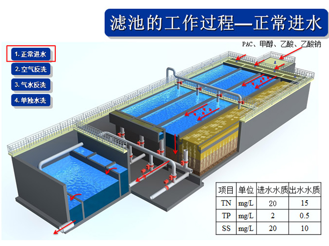 碳源存儲和供給系統(tǒng):一般為乙酸鈉,根據(jù)進入濾池的硝酸氮量來控制碳源投加量。