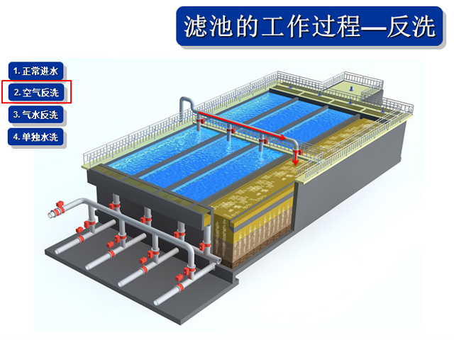 1、氣水聯(lián)合反沖冼裝置、布氣裝置、操作工藝等系統(tǒng)集成技術(shù)解決直接過濾、生物濾池生物膜脫落堵塞濾池的問題。