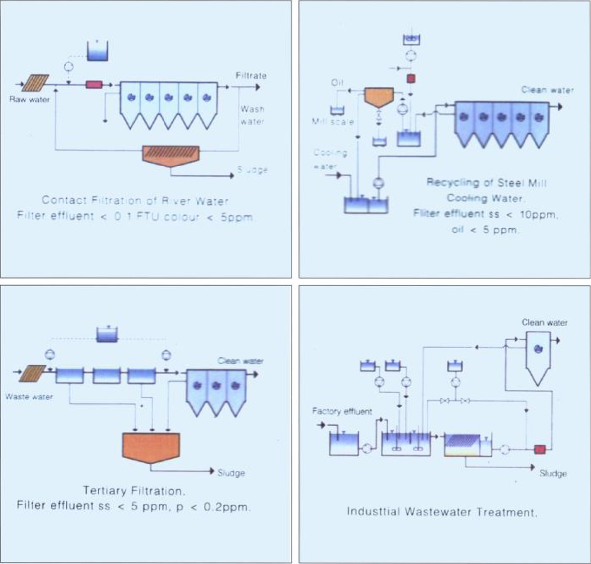 連續(xù)接觸式過(guò)濾用于將河和湖水生產(chǎn)成工業(yè)用水或飲用水,也用于廢水處理:絮凝化學(xué)藥品被添加到連續(xù)流砂過(guò)濾器進(jìn)水,濾床前部作為反應(yīng)介質(zhì)為絮凝物快速形成提供了好的條件,無(wú)需絮凝池。而且因?yàn)檫B續(xù)流砂過(guò)濾器具備處理高濃度懸浮固體的能力,所以污水不需要預(yù)沉降。