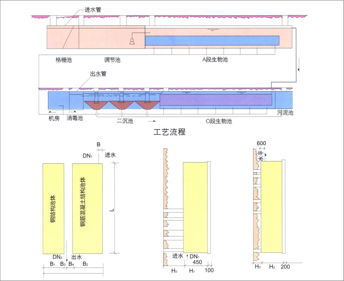 O級生物池:WSZ-AO系列O級生物池為推流式生物接觸氧化池,污水在池內的停留學時間為5-6小時,填料為彈性立體填料,填料比表面積為200m³/m²。